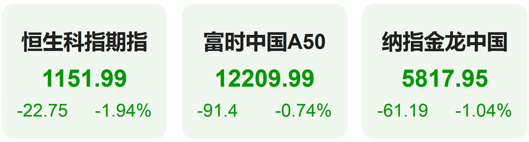 上周五恒生科技指数期货下跌1.94%,纳斯达克中国金龙指数下跌1.04%,富时中国A50指数下跌0.74%。