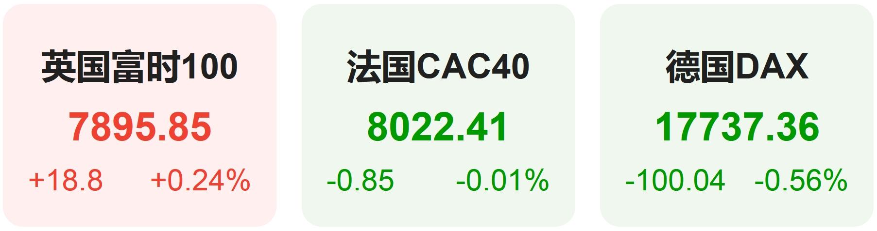 上周五,欧洲股市方面,英国富时100指数小幅上涨0.24%,报7896点。法国CAC40指数小幅下跌0.01%,报8022点。德国DAX指数小幅下跌0.56%,报17737点。