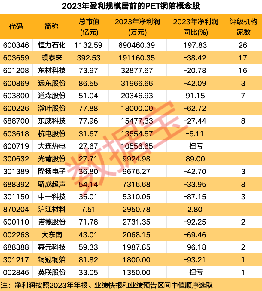 这些PET铜箔概念股盈利规模居前