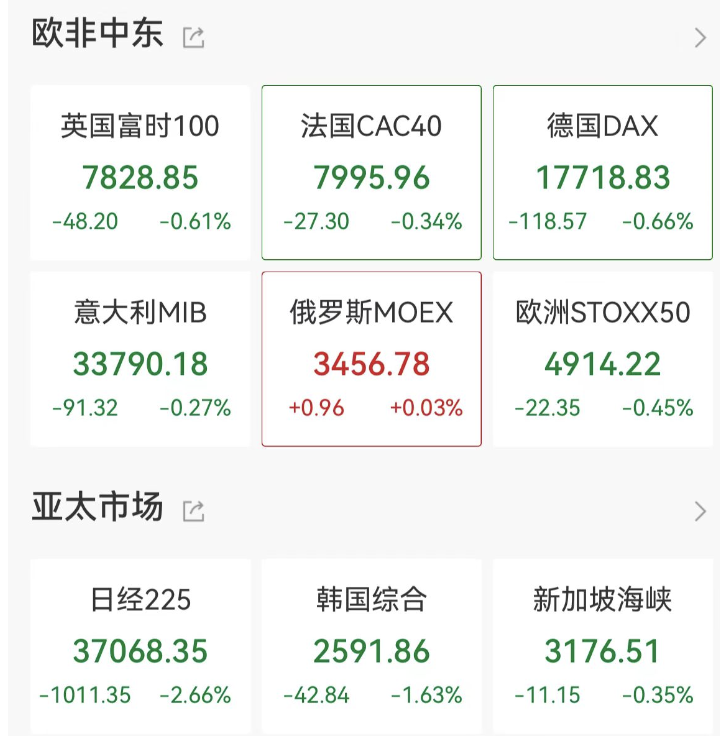 受地缘事件冲击影响,今日亚太地区股市全面下跌。日经225收跌2.66%,韩国综合指数跌1.63%。欧洲股市也多以跌势开盘。截至18点32分,英国富时100跌0.61%,法国CAC40跌0.34%,德国DAX跌0.66%。