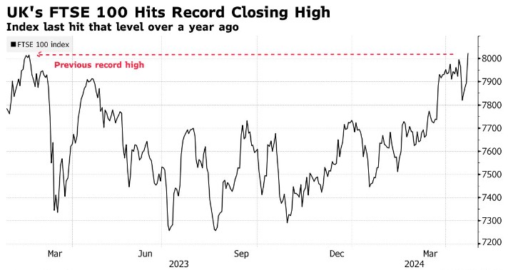 获悉,英国富时100指数自2023年2月以来首次收于创纪录高位,近期股市波动和地缘政治风险促使投资者涌入作为英国基准股指特征的防御性板块——包括能源股等。英国富时100指数周一收涨1.6%,至8023.87点,突破了2023年2月创下的8014.31点的收盘峰值。仍低于盘中高点8047.06;该指数今年迄今上涨约4%,仅壳牌(SHEL.US)和英国石油(BP.US)就贡献了近一半涨幅。