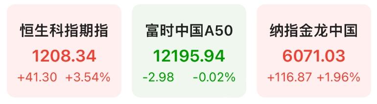 隔夜恒生科技指数期货上涨3.54%,纳斯达克中国金龙指数上涨1.96%,富时中国A50指数下跌0.02%。