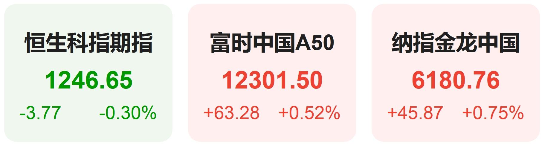 隔夜恒生科技指数期货下跌0.30%,纳斯达克中国金龙指数上涨0.75%,富时中国A50指数上涨0.52%。