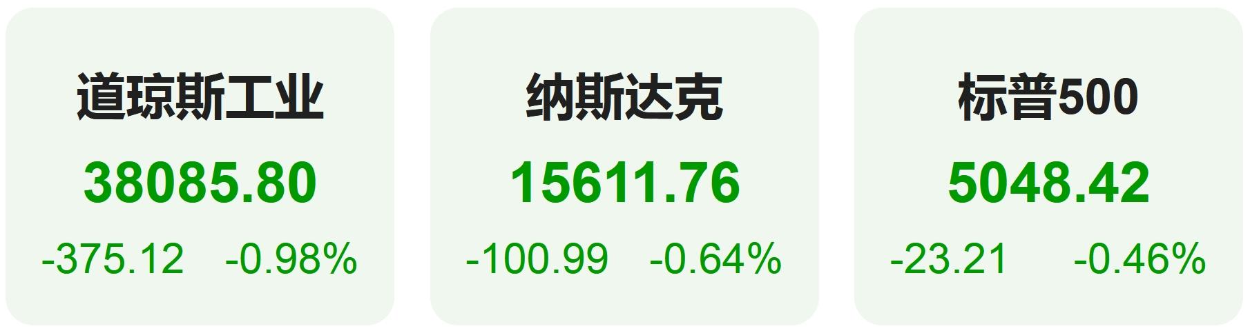 截至收盘,标普500指数跌0.46%,报5048.42点;道琼斯指数跌0.98%,报38085.80点;纳斯达克指数跌0.64%,报15611.76点。