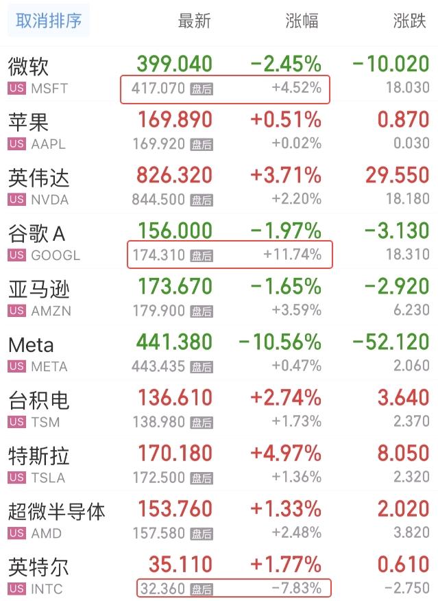 其中,谷歌和微软盘后公布财报超预期,且谷歌史上首次分红,股价盘后大涨12%,微软也有近5%的表现。但英特尔Q2营收展望不及预期,股价盘后大跌近8%。