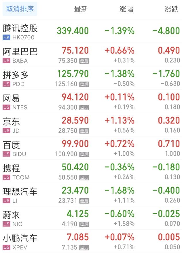 热门中概股方面,腾讯控股(港股)跌1.39%,阿里巴巴涨0.66%,拼多多跌1.38%,网易涨0.11%,百度涨0.72%,携程跌0.36%,理想汽车跌1.68%,蔚来跌0.60%,小鹏汽车涨0.07%。