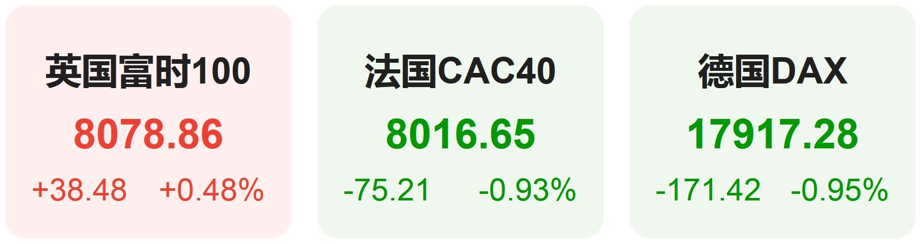欧洲股市方面,英国富时100指数小幅上涨0.48%,报8079点。法国CAC40指数小幅下跌0.93%,报8017点。德国DAX指数小幅下跌0.95%,报17917点。