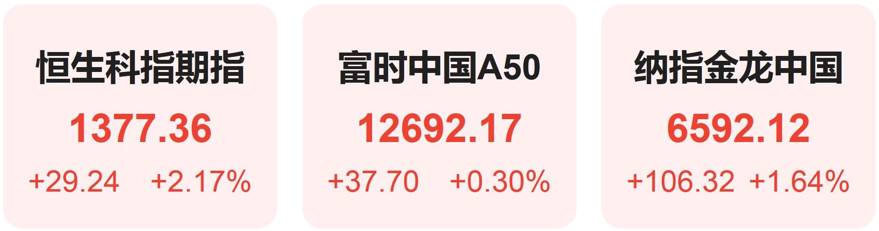 隔夜恒生科技指数期货上涨2.17%,纳斯达克中国金龙指数上涨1.64%,富时中国A50指数上涨0.30%。