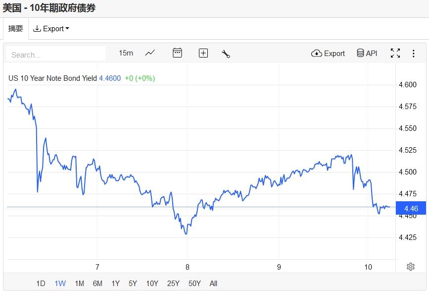 基准10年期美债收益率失守4.5%关口,收报4.46%。对美联储政策利率最敏感的2年期美债收益率收报4.8%。