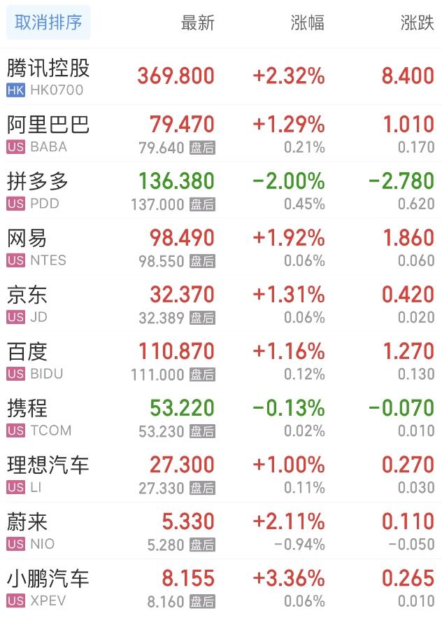 热门中概股方面,腾讯控股(港股)涨2.32%,阿里巴巴涨1.29%,拼多多跌2.00%,网易涨1.93%,百度涨1.16%,携程跌0.13%,理想汽车涨1.00%,蔚来涨2.11%,小鹏汽车涨3.36%。