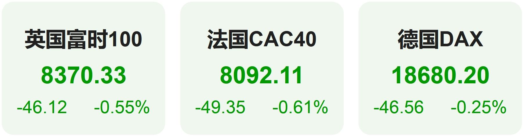 欧洲股市方面,英国富时100指数小幅下跌0.55%,报8370点。法国CAC40指数小幅下跌0.61%,报8092点。德国DAX指数小幅下跌0.25%,报18680点。