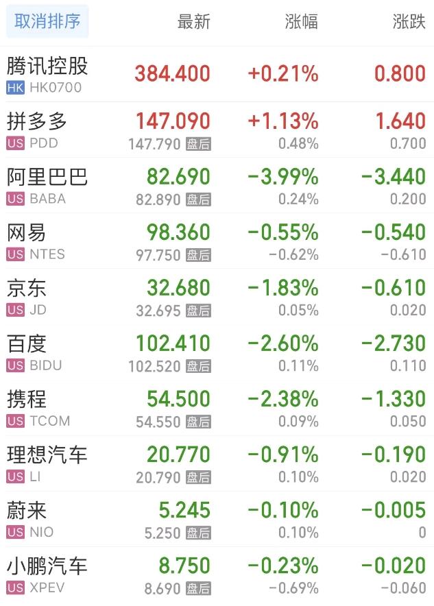 热门中概股方面,腾讯控股(港股)涨0.21%,阿里巴巴跌3.99%,网易跌0.55%,百度跌2.60%,携程跌2.38%,理想汽车跌0.91%,蔚来跌0.10%,小鹏汽车跌0.23%。