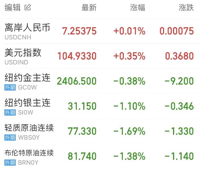 美元指数反弹至周内新高,向上逼近105关口,最终收涨0.35%,报104.93。