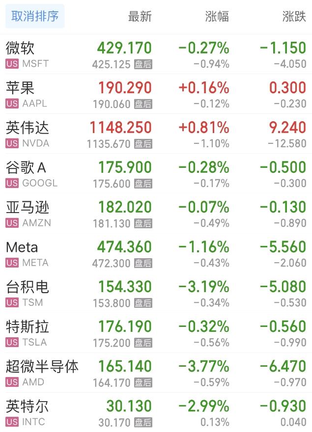 热门美股中,微软跌0.27%,苹果涨0.16%,谷歌C跌0.35%,谷歌A跌0.28%,亚马逊跌0.07%,Meta跌1.16%,台积电跌3.19%,特斯拉跌0.32%,超微半导体跌3.77%,英特尔跌2.99%。