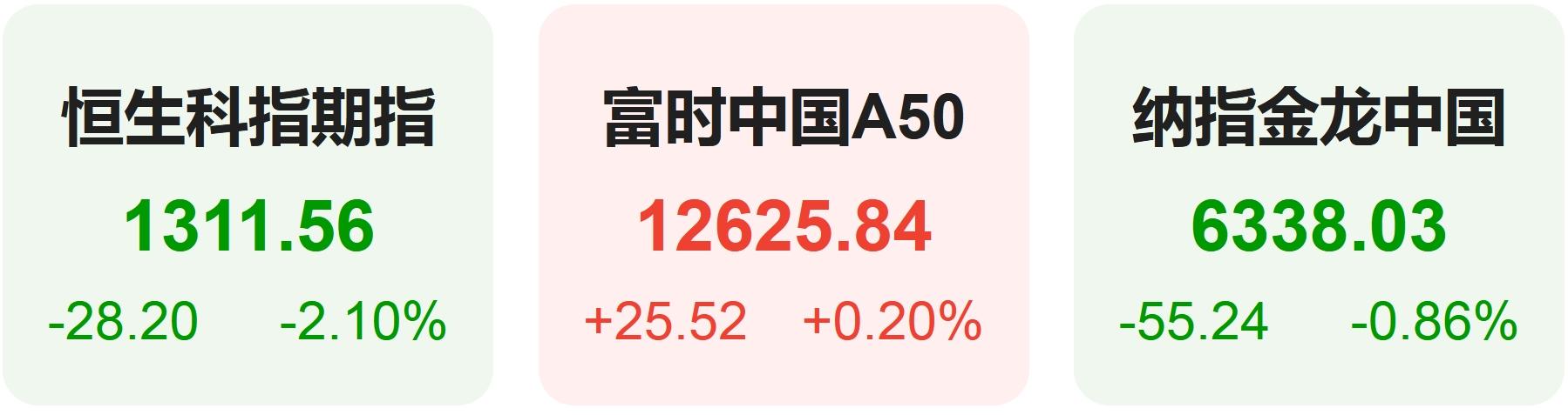 隔夜恒生科技指数期货下跌2.10%,纳斯达克中国金龙指数下跌0.86%,富时中国A50指数上涨0.20%。