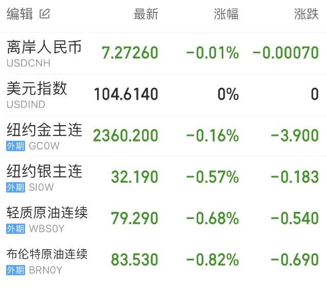 热门中概股方面,腾讯控股(港股)跌2.42%,拼多多涨1.04%,阿里巴巴跌1.87%,网易跌1.79%,百度跌1.29%,携程跌1.68%,理想汽车跌1.08%,蔚来涨0.51%,小鹏汽车跌2.67%。