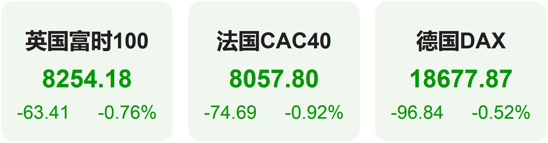 欧洲股市方面,英国富时100指数小幅下跌0.76%,报8254点。法国CAC40指数小幅下跌0.92%,报8058点。德国DAX指数小幅下跌0.52%,报18678点。