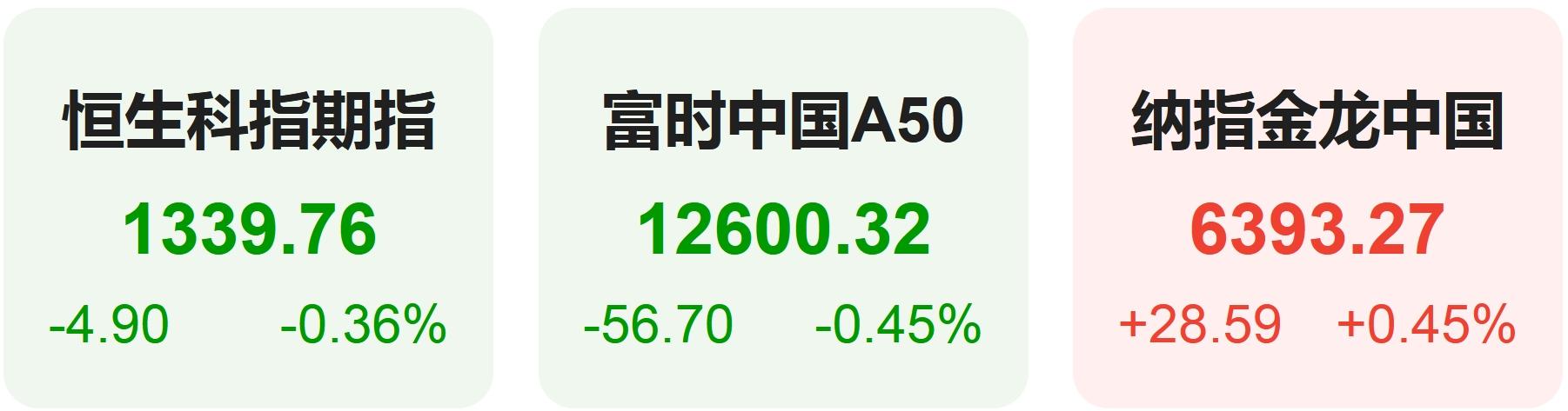 隔夜恒生科技指数期货下跌0.36%,纳斯达克中国金龙指数上涨0.45%,富时中国A50指数下跌0.45%。