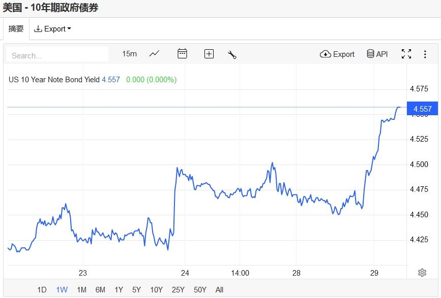 美债收益率攀升至近四周新高,基准10年期美债收益率收报4.557%,对美联储政策利率最敏感的2年期美债收益率收报4.94%。