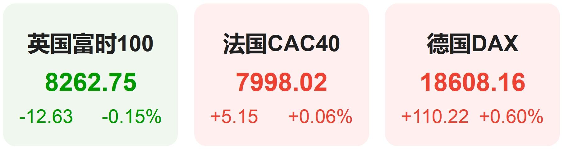 欧洲股市方面,英国富时100指数小幅下跌0.15%,报8263点。法国CAC40指数小幅上涨0.06%,报7998点。德国DAX指数小幅上涨0.60%,报18608点。