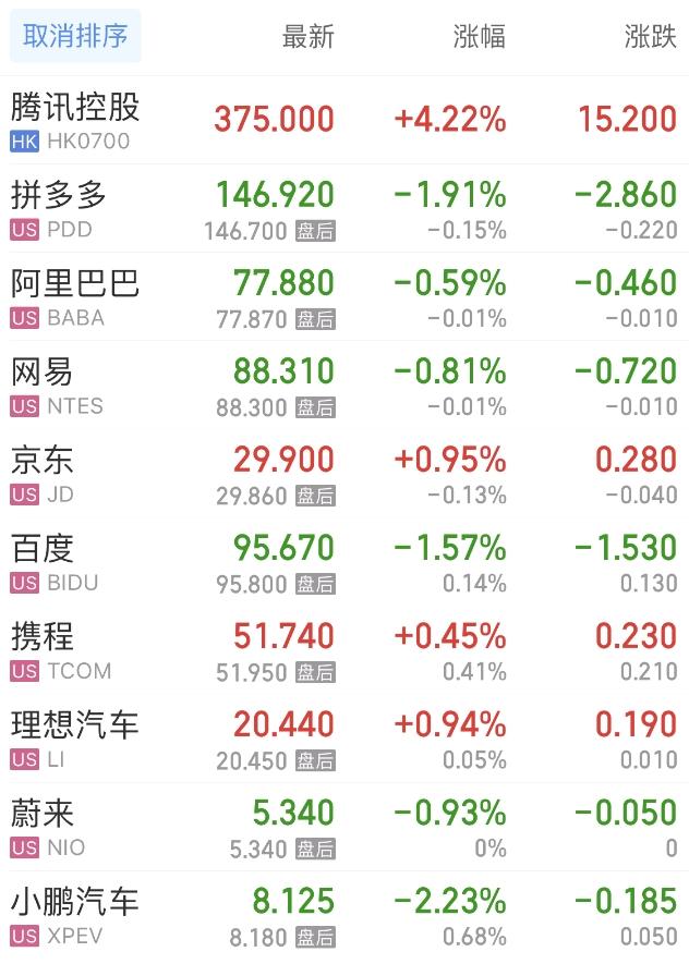热门中概股方面,腾讯控股(港股)涨4.22%,拼多多跌1.91%,阿里巴巴跌0.59%,网易跌0.81%,百度跌1.57%,携程涨0.45%,理想汽车涨0.94%,蔚来跌0.93%,小鹏汽车跌2.23%。