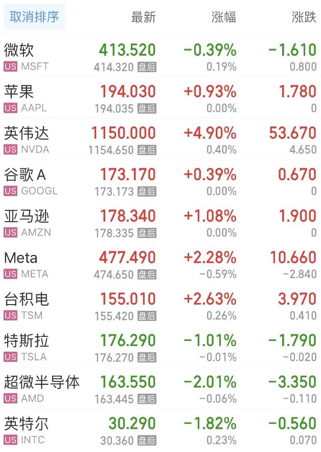 热门美股中,微软跌0.39%,苹果涨0.93%,谷歌A涨0.39%,亚马逊涨1.08%,Meta涨2.28%,台积电涨2.63%,特斯拉跌1.01%,超微半导体跌2.01%,英特尔跌1.82%。