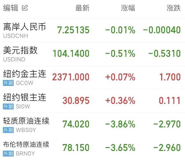 PMI数据显示美国经济正在逐步放缓,美元指数跌至三周低点,最终收跌0.51%,报104.14。