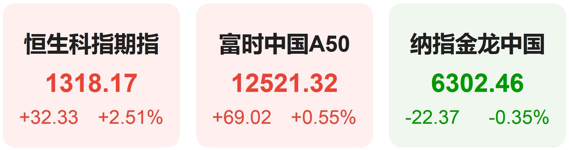 隔夜恒生科技指数期货上涨2.51%,纳斯达克中国金龙指数下跌0.35%,富时中国A50指数上涨0.55%。