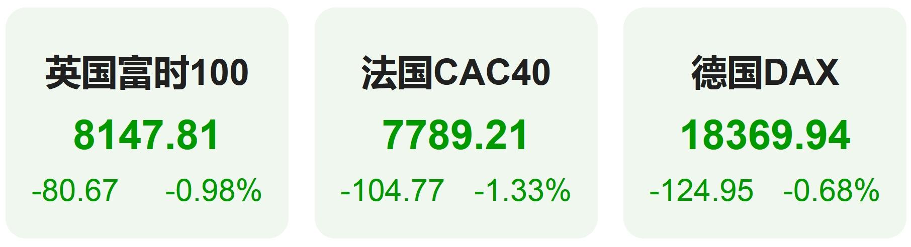 欧洲股市方面,英国富时100指数小幅下跌0.98%,报8148点。法国CAC40指数下跌1.33%,报7789点。德国DAX指数小幅下跌0.68%,报18370点。