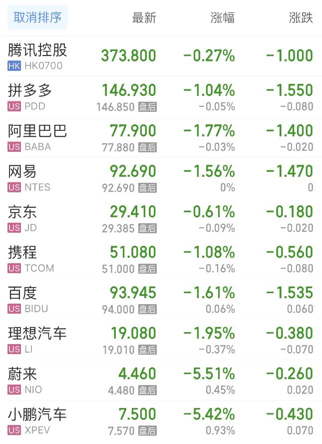 热门中概股方面,腾讯控股(港股)跌0.27%,拼多多跌1.04%,阿里巴巴跌1.77%,网易跌1.56%,携程跌1.08%,百度跌1.61%,理想汽车跌1.95%,蔚来跌5.51%,小鹏汽车跌5.42%。
