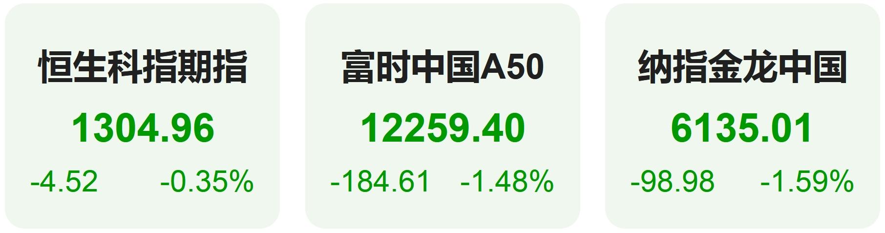 隔夜恒生科技指数期货下跌0.35%,纳斯达克中国金龙指数下跌1.59%,富时中国A50指数下跌1.48%。