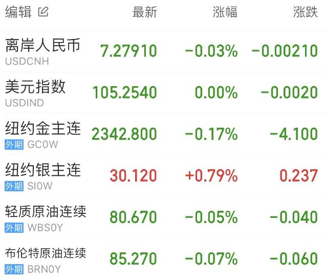 COMEX黄金收跌0.18%,报2343美元/盎司。COMEX白银最终收涨0.86%,报30.14美元/盎司。