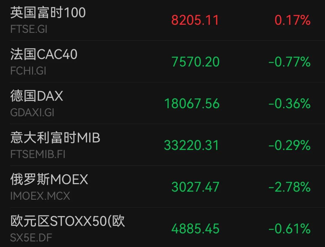 当地时间6月19日,欧洲主要股指收盘跌多涨少。德国DAX指数跌0.36%报18067.56点,法国CAC40指数跌0.77%报7570.2点,英国富时100指数涨0.17%报8205.11点。
