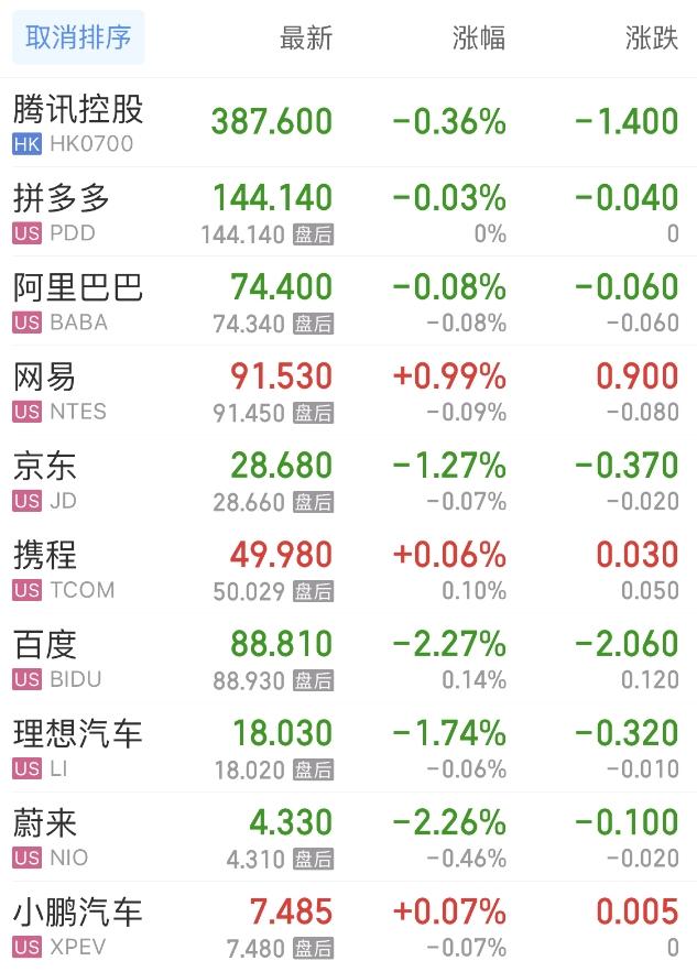 热门中概股方面,腾讯控股(港股)跌0.36%,拼多多跌0.03%,阿里巴巴跌0.08%,网易涨0.99%,携程涨0.06%,百度跌2.27%,理想汽车跌1.74%,蔚来跌2.26%,小鹏汽车涨0.07%。