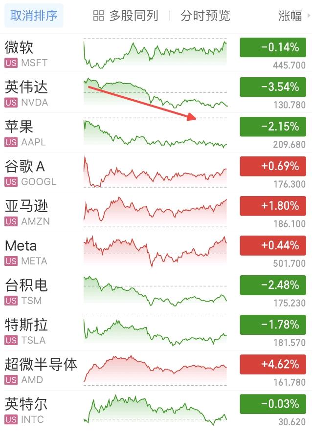 热门美股中,微软跌0.14%,英伟达跌3.54%,苹果跌2.15%,谷歌A涨0.69%,亚马逊涨1.80%,Meta涨0.44%,台积电跌2.48%,特斯拉跌1.78%,超微半导体涨4.62%,英特尔跌0.03%。