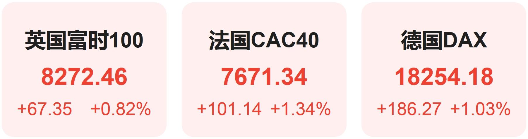欧洲股市方面,英国富时100指数小幅上涨0.82%,报8272点。法国CAC40指数上涨1.34%,报7671点。德国DAX指数上涨1.03%,报18254点。