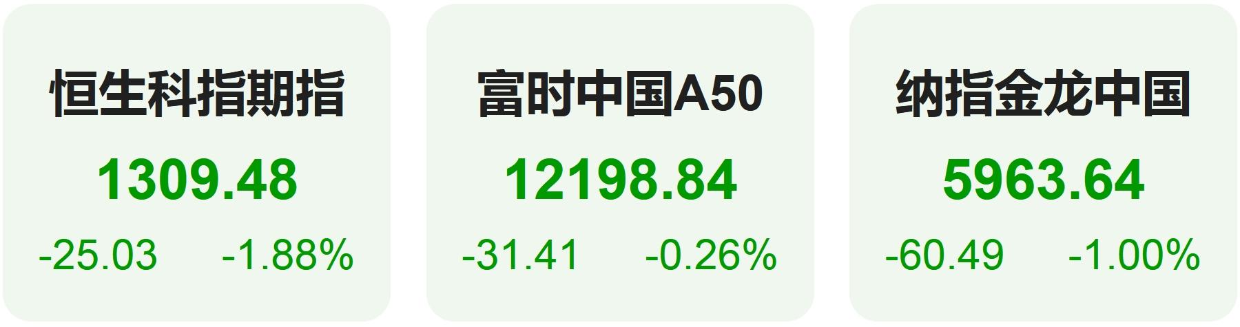 隔夜恒生科技指数期货下跌1.88%,纳斯达克中国金龙指数下跌1.00%,富时中国A50指数下跌0.26%。