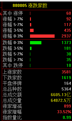 个股涨多跌少,全市场超3500股飘红,今日成交6607亿元。