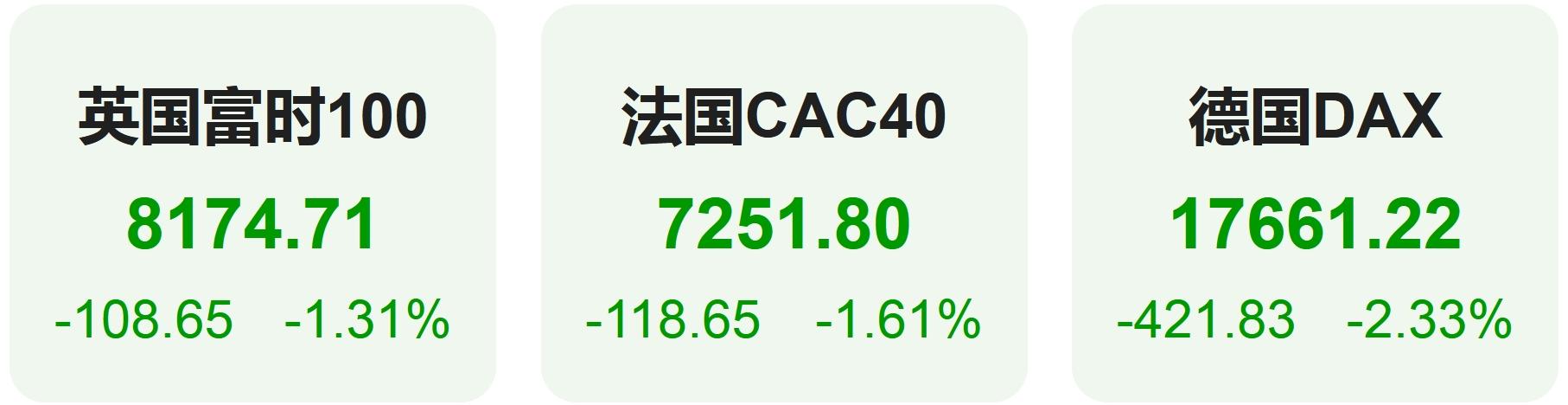 上周五,欧洲股市方面,英国富时100指数下跌1.31%,报8175点。法国CAC40指数下跌1.61%,报7252点。德国DAX指数大跌2.33%,报17661点。