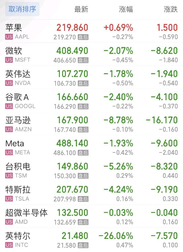 热门美股中,苹果涨0.69%,微软跌2.07%,英伟达跌1.78%,谷歌C跌2.35%,谷歌A跌2.40%,亚马逊跌8.78%,Meta跌1.93%,台积电跌5.26%,特斯拉跌4.24%,超微半导体跌0.03%。