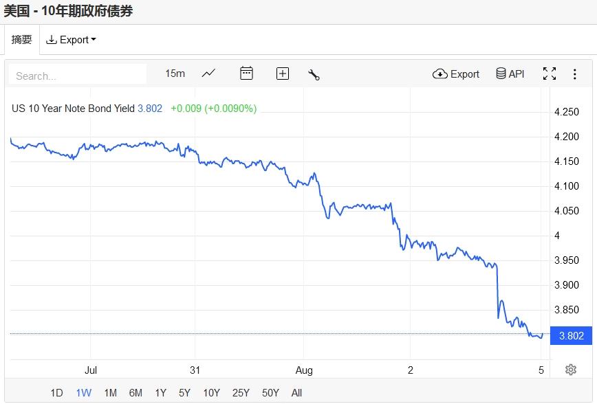 上周五美债收益率大跌,基准的10年期美债收益率跌破3.8%,收报3.793%,两年期美债收益率失守4%关口,收报3.890%。