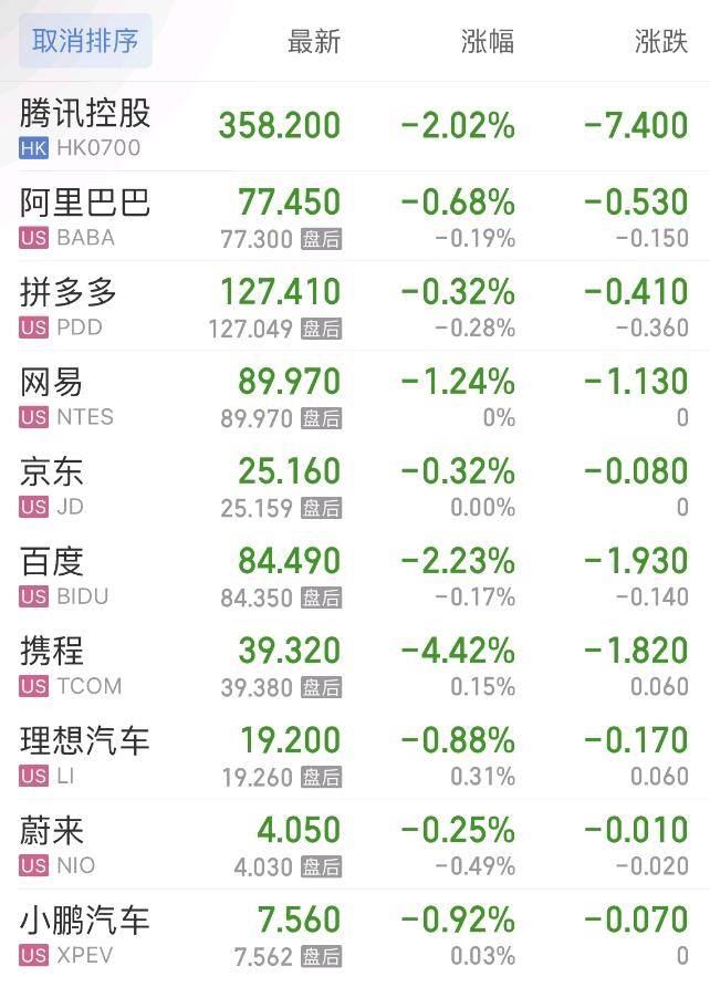 上周五热门中概股方面,腾讯控股(港股)跌2.02%,阿里巴巴跌0.68%,拼多多跌0.32%,网易跌1.24%,百度跌2.23%,携程跌4.42%,理想汽车跌0.88%,蔚来跌0.25%,小鹏汽车跌0.92%。