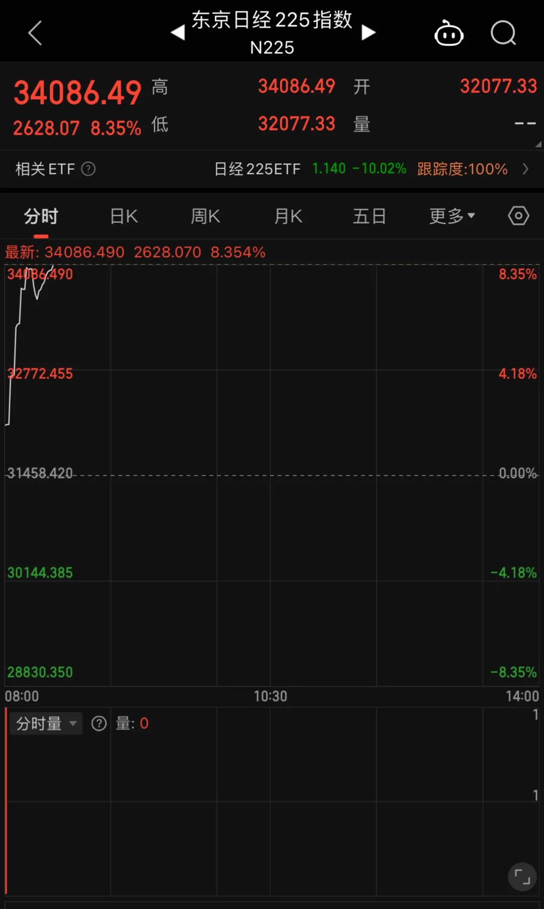日韩股市大幅高开,日经225指数开盘后迅速大涨逾2600点,涨幅超过8%;韩国综合指数开盘涨超4%。个股方面,现代汽车、SK海力士开盘涨近6%,三星电子开盘涨超5%,日本电报电话开盘涨超3%。