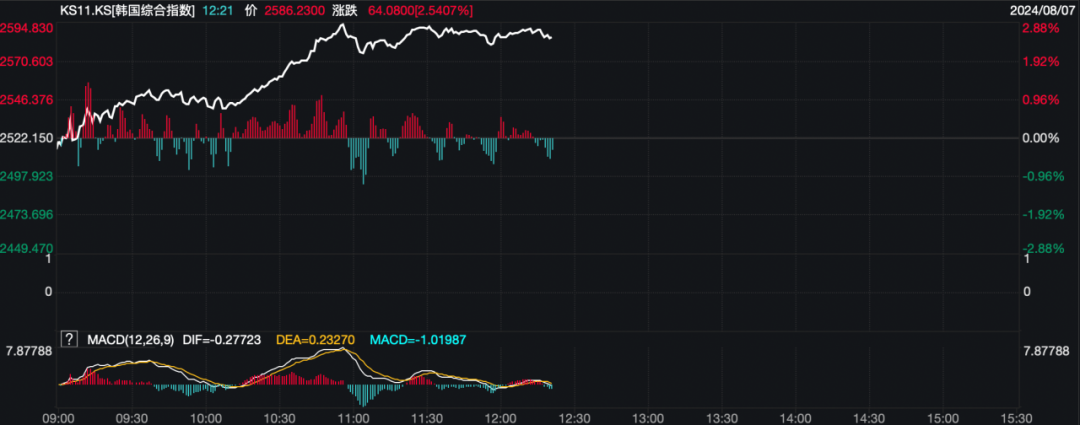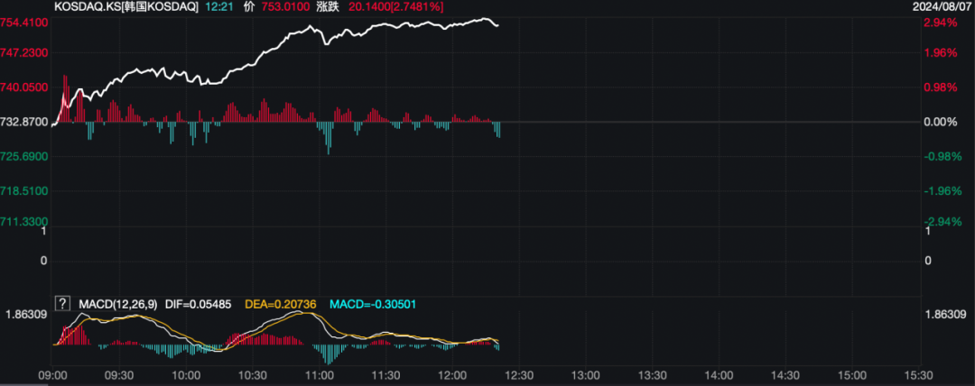 韩国股市上午低开高走,截至发稿,韩国综合指数、韩国KOSDAQ指数盘中涨幅均超过2%。
