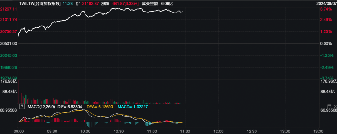 台湾地区股市今天上午强劲反弹,台湾加权指数盘中涨幅超过3%。