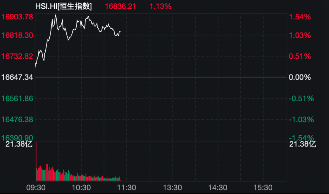 港股市场上午表现较佳,恒生指数盘中涨幅一度超过1.5%。