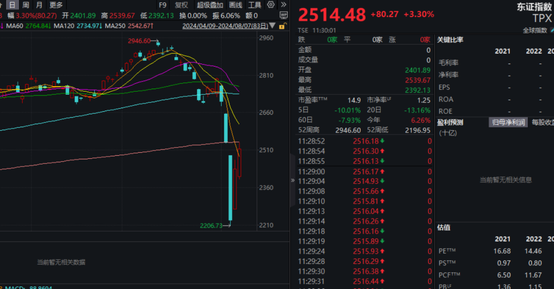 日本股市方面,东证指数盘中快速拉升,一度大涨逾4%,上涨超过100点。连续两天强劲反弹后,已将前天暴跌留下的巨大跳空缺口回补。