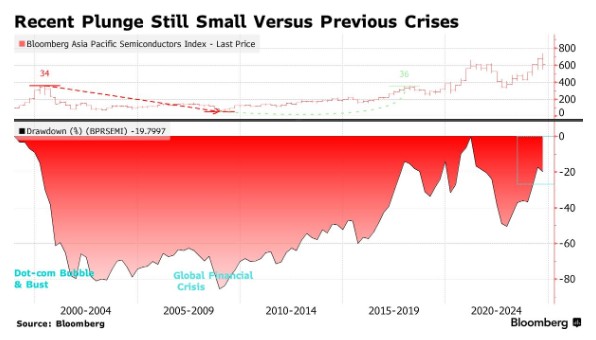 Bloomberg亚太半导体指数从7月的高点下跌了近20%,但与过去20年来记录的最大跌幅相比,这一跌幅相对较小。该指数在全球金融危机和互联网泡沫破灭期间下跌了约80%。