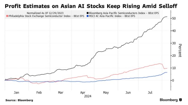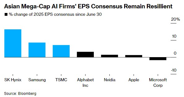 尽管近期出现暴跌,但分析师们提高了对亚洲主要芯片股的盈利预期,这与美国不同,自7月底以来,美国芯片股的预期一直被下调。在最近的抛售之后,摩根士丹利重新将台积电列为其首选,理由是该公司“在漫长的半导体下行周期中具有质量和防御性质”。