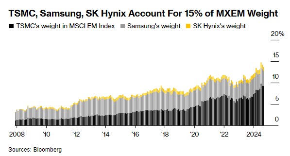 亚洲科技股仍是一股不可忽视的力量,尽管该股出现了自2022年底以来最长的单周跌幅。台积电、三星和SK海力士的总市值为1.2万亿美元,而十年前为3120亿美元。根据计算,他们在MSCI新兴市场指数中的权重已从2007年底的不到4%增加到近15%。